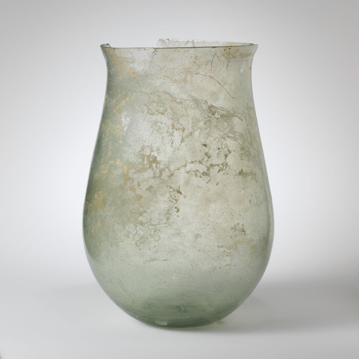 Broken and repaired with parts of neck and upper body missing; many pinprick and some larger bubbles, with blowing striations; dulling, slight pitting, and faint iridescence on exterior, some soil encrustation and patches of iridescent weathering on interior.