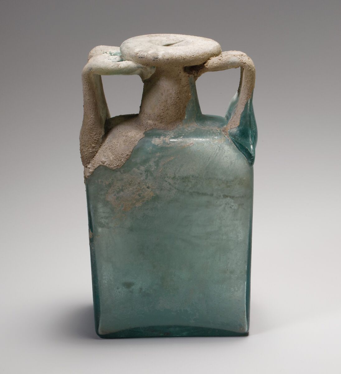 Rim folded out, down, round, and in, and pressed flat on top around mouth; cylindrical neck, expanding downwards; horizontal shoulder with rounded, sloping corners; flat, vertical sides; concave bottom with large circular pontil mark; two broad strap handles, tooled into three ribs on outer surface, attached to outer edge of shoulder on short sides, drawn up vertically, turned in at right angle and trailed onto top of neck and underside of rim.