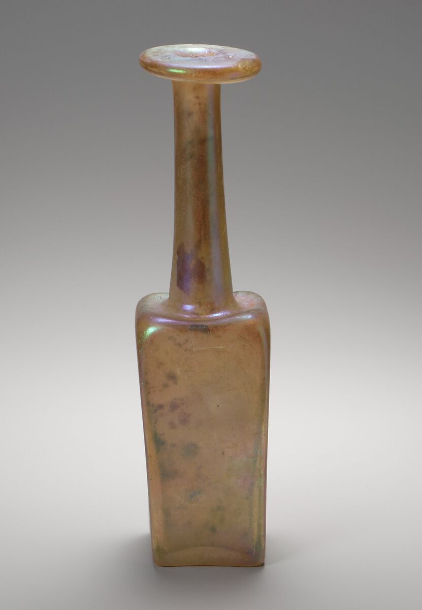 Bottles of this type are often called Mercury flasks because the figure of Mercury, the Roman god of commerce and trade, appears in molded relief on the bottom of some examples. On the bottom of this bottle is a peacock with outstretched tail feathers. These sturdy and very portable containers are found mainly in Italy and the western provinces; they are virtually unknown from the eastern half of the Empire.