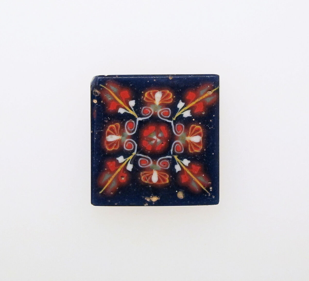 Translucent cobalt blue ground; decoration in opaque white, yellow, red, reddish brown, and greyish green.