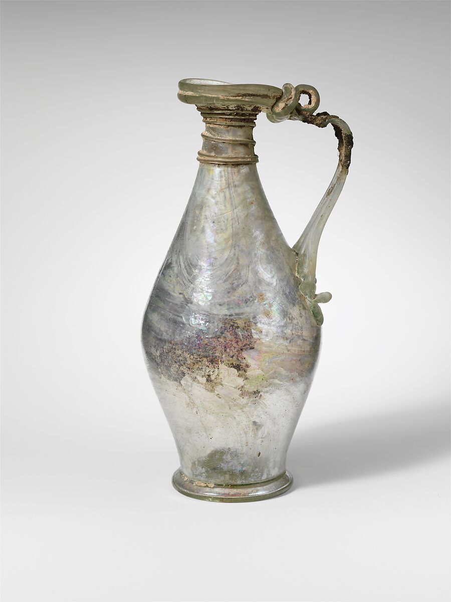 Body intact, but top of handle broken and repaired below hollow roll (with alien piece of glass); bubbles and blowing striations; some soil encrustation, especially around neck, slight dulling, whitish weathering, and brilliant iridescence.