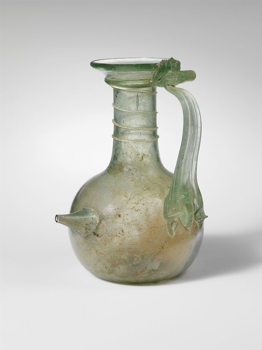 Plain, rounded rim; flaring mouth; cylindrical neck; rounded shoulder; squat, globular body; slightly concave bottom, with deep pontil scar; three-ribbed strap handle, applied to upper body, with claws extending downwards, the central one being larger and pointed, each of the two outer ones tooled to have a pinched, horizontal projection; curving handle drawn up and in, and folded onto underside of mouth and edge of rim, with jagged end above; tubular spout dropped onto body as a blob, piercing side, then drawn out and knocked off.