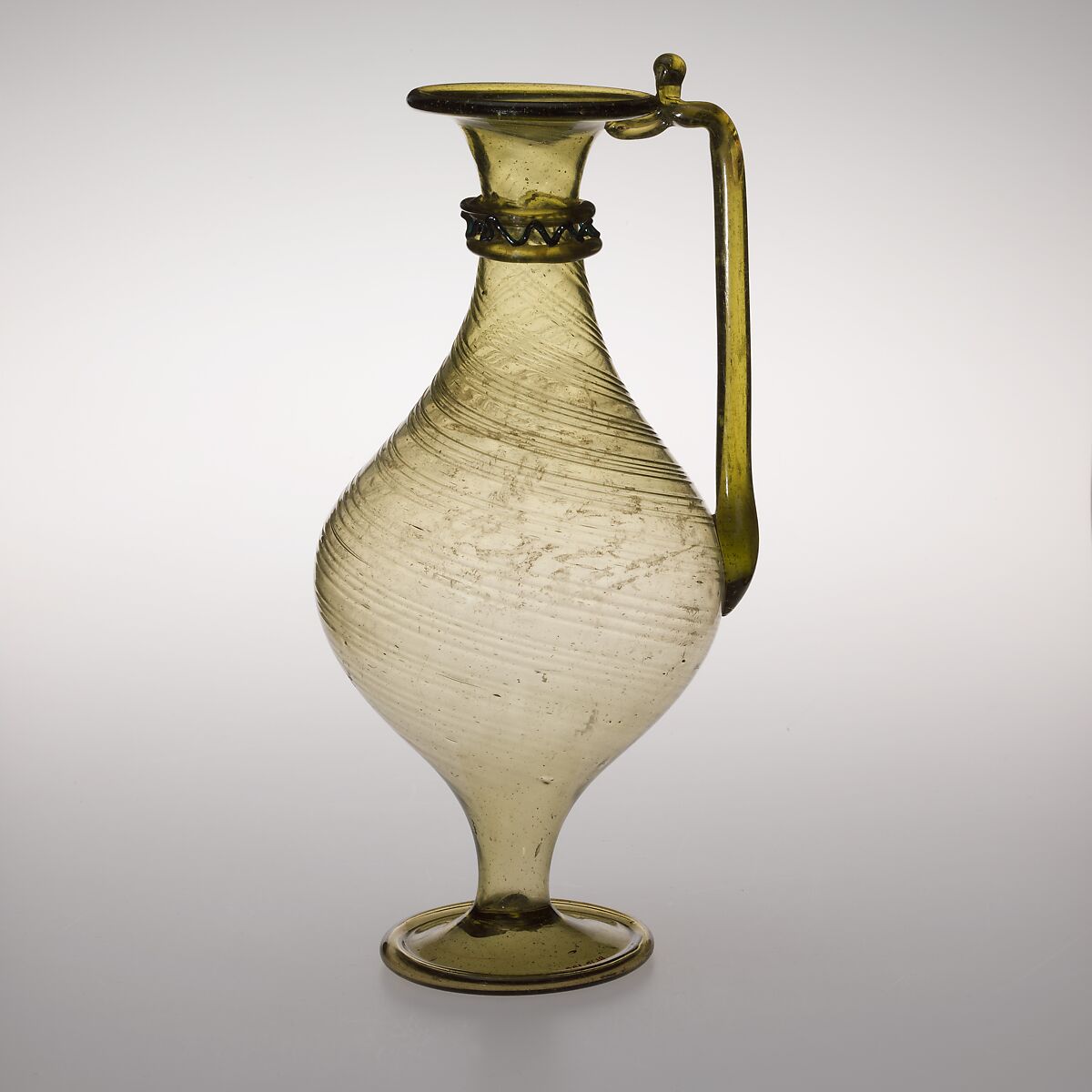 Everted, horizontal rim with rounded lip; flaring mouth and short cylindrical neck; bulbous, biconical body, then tapering to hollow stem; large splayed foot with thick tubular edge made by folding; concave bottom with small kick at center and large pontil scar; rod handle to side of body at point of greatest diameter, drawn up vertically, turned in with pinched fold above rim, and trailed off under rim.
