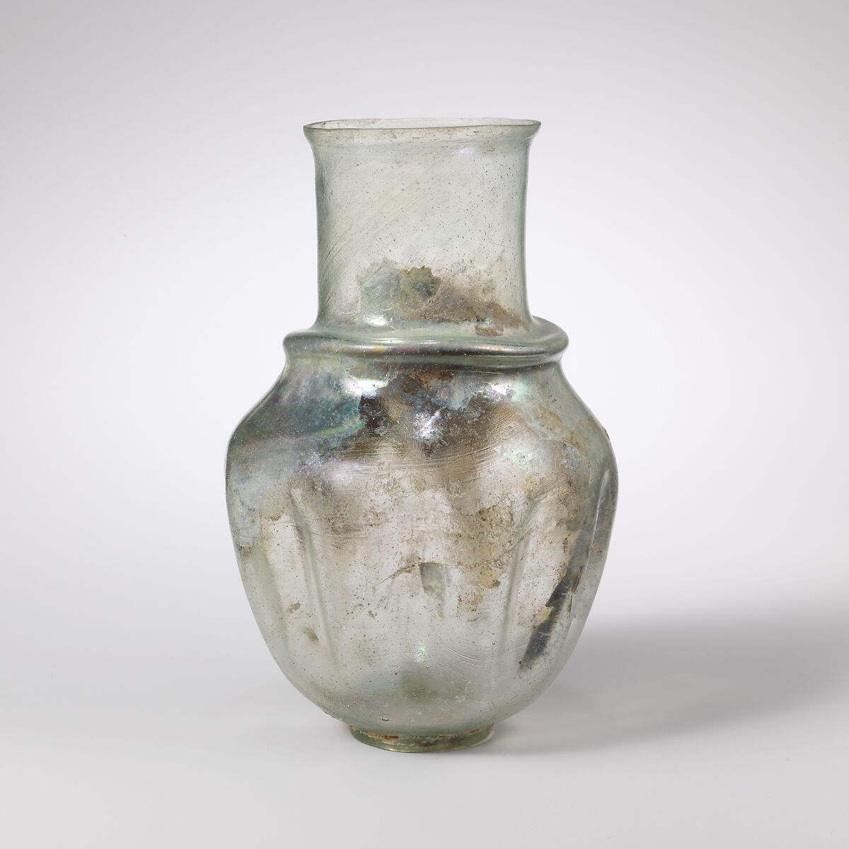 Intact; many pinprick and a few larger bubbles, and blowing striations; iridescence and small patches of soil encrustation and weathering on exterior; thick soil deposits on interior, covering brilliant iridescent weathering.