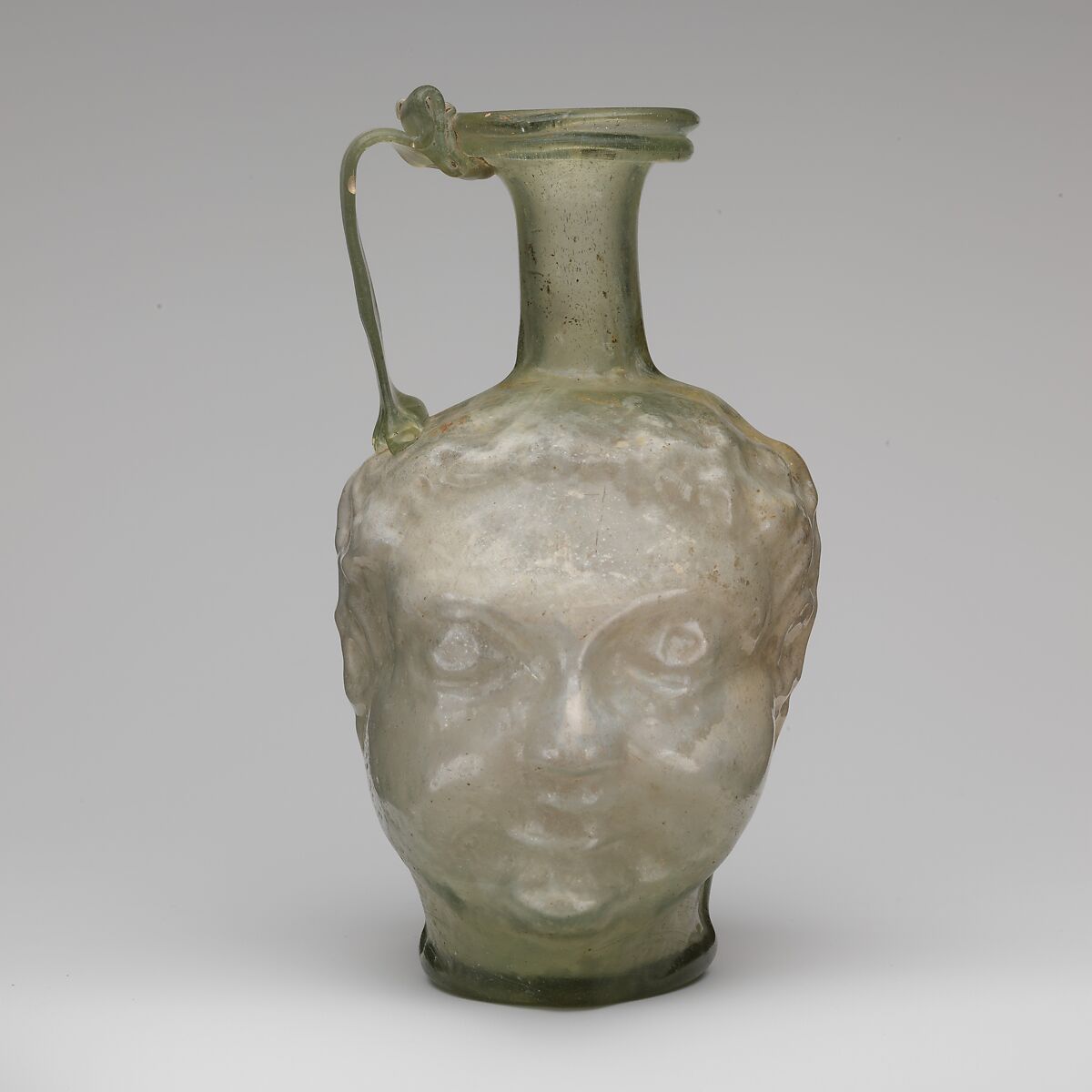 Rounded and thickened rim; flaring mouth; cylindrical neck; body in the shape of a double head; irregular thick bottom, with central kick and traces of pontil scar; broad strap handle with combed outer surface attached to side of head above proper left ear, drawn up and slightly outward, then turned in and down, and trailed in folds onto underside of mouth and rim over trail decoration. A continuous mold seam runs from the base of neck, down body, and across bottom.