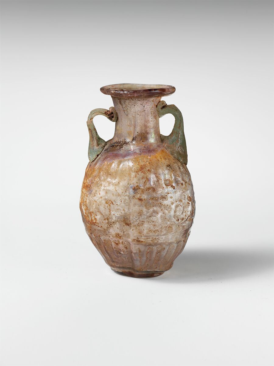 Rim folded out, down, round, and in, and pressed into sides of mouth; cylindrical neck; ovoid body; low cylindrical base, with concave, oval bottom; rod handles attached in large claw pads to shoulder, drawn up, round, and in, and folded onto neck. One continuous mold seam around body and across bottom, but edges of molds not carefully aligned.