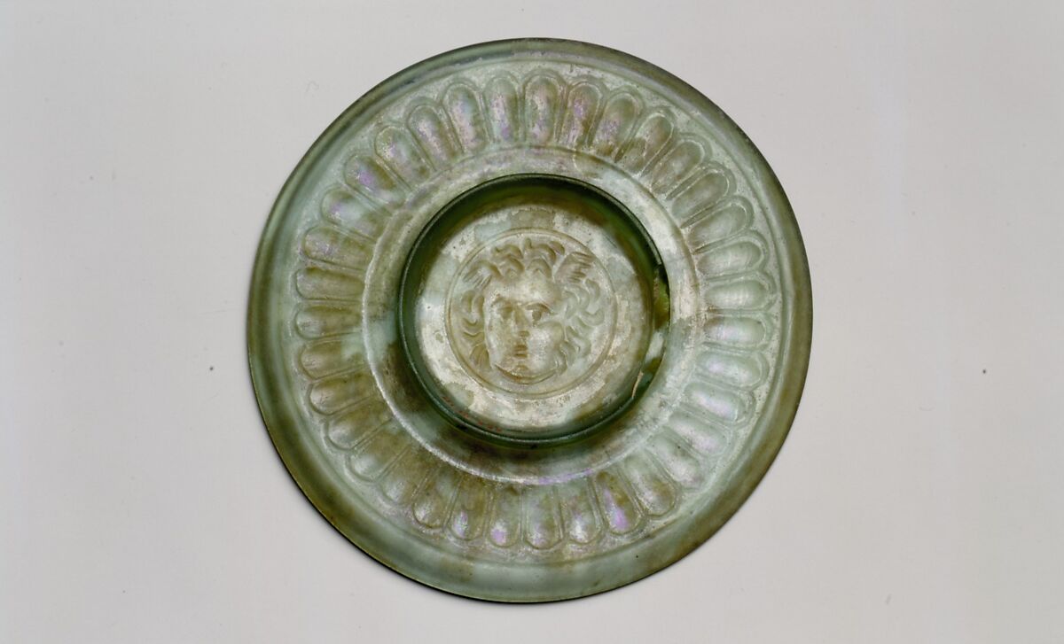 On underside of body, circular pattern of thirty-five outward-pointing incised tongues, outlined with incised lines, within a raised border around base ring; with base ring, an incised circle surrounds an engraved head of Medusa with flowing locks and wings, facing frontally but looking slightly to the left.