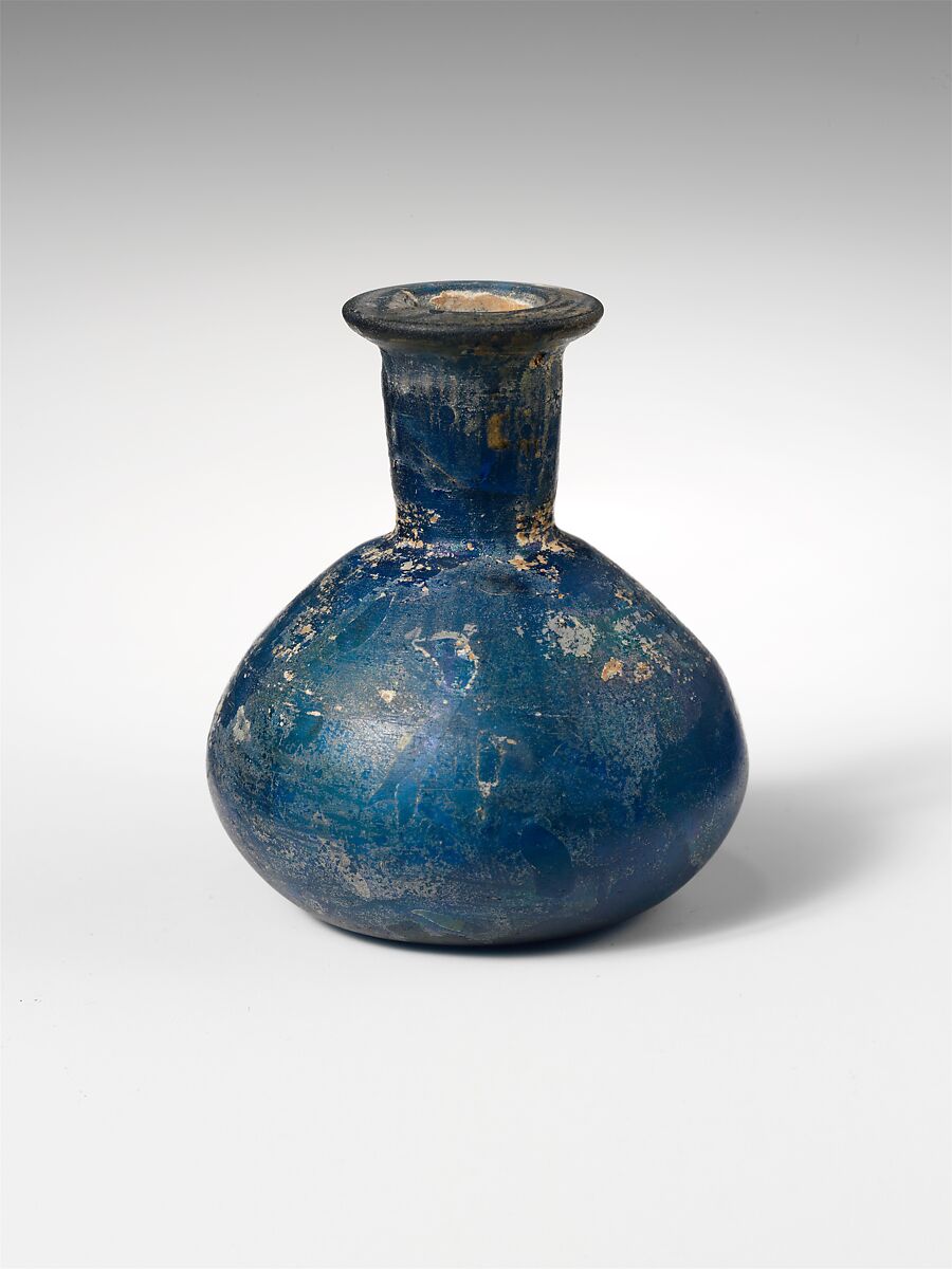Intact, but internal and one surface crack on interior of neck; dulling, pitting, and creamy, iridescent weathering.