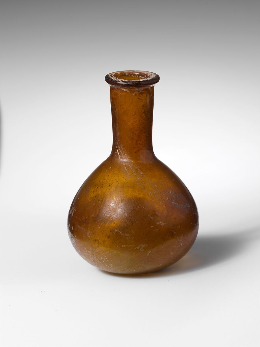 Everted, horizontal rim with rounded outer lip; cylindrical neck, tapering downward, with slight tooling marks around base; squat piriform body; small flat bottom.