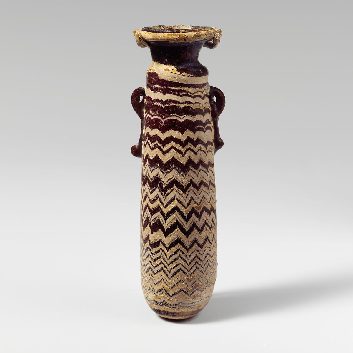 Uneven horizontal rim-disk, with radiating tooling marks on upper surface and rough edge to mouth; off-center cylindrical neck, tapering downwards; narrow rounded shoulder; slightly convex sides to cylindrical body, tapering upwards; convex bottom; two large vertical ring handles with knobbed tails, applied over trail decoration; one tail longer than the other.