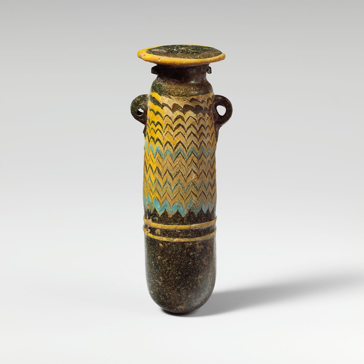 Yellow trail attached at edge of rim-disk; a second yellow trail applied on top of body and wound down in a spiral, tooled into a close-set zigzag pattern; halfway down pattern a turquoise blue trail is added, mingling with yellow; immediately below zigzag, a third unmarvered yellow trail wound horizontally twice around body.