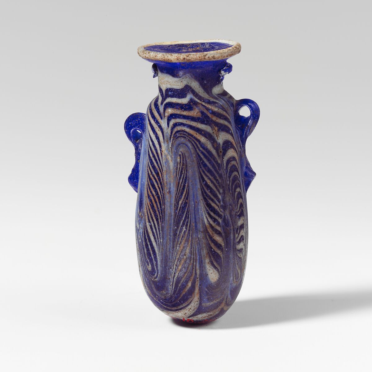 A trail attached at edge of rim-disk; another trail applied on neck in a thick marvered pad, wound down, tooled into an irregular feather pattern, with strokes mixing and blurring trails with blue ground.