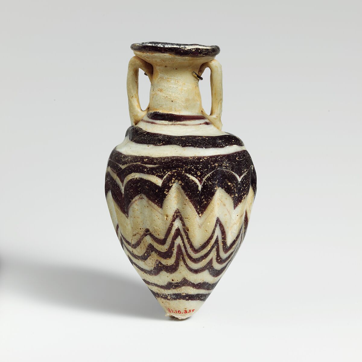 These glass vessels with opaque white bodies and purple threads have been found throughout the Greek world, but most examples are from cemeteries and sanctuaries in the eastern Mediterranean.