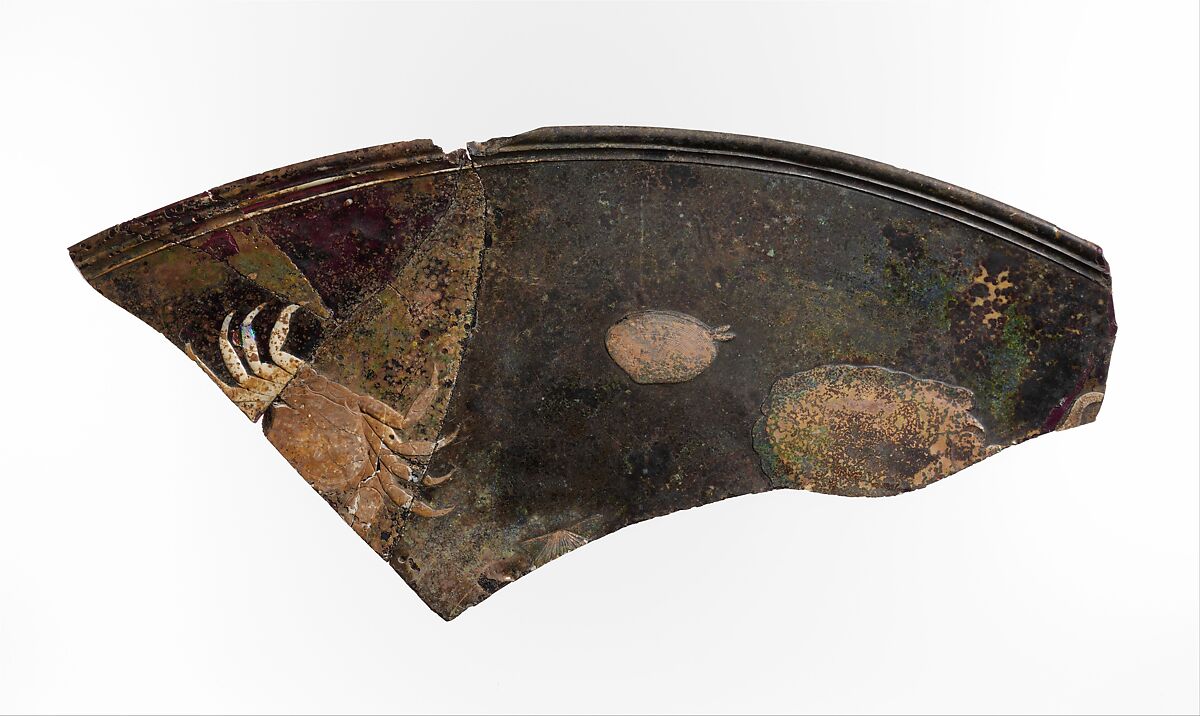 Over a background of deep purple (representing Homer's "wine-dark sea"), a layer of opaque white glass have been added and then carved to represent various sea creatures. The fragment is said to have been found on the island of Capri (in the Bay of Naples, Italy), near the imperial villa where the Emperor Tiberius lived in seclusion between A.D. 27 and 37.