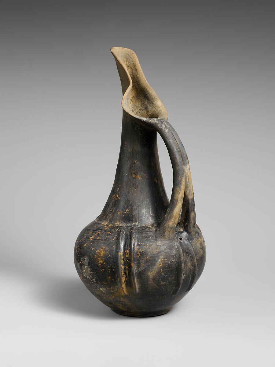 The distinctive beak-spout of this jug indicates that it is a local imitation of a type imported to Italy from the Eastern Mediterranean with increasing frequency into the seventh century B.C. This particular type, with split handle and modeled ribs, was especially popular in Bisenzio, during the transition between Villanovan and Early Etruscan culture.