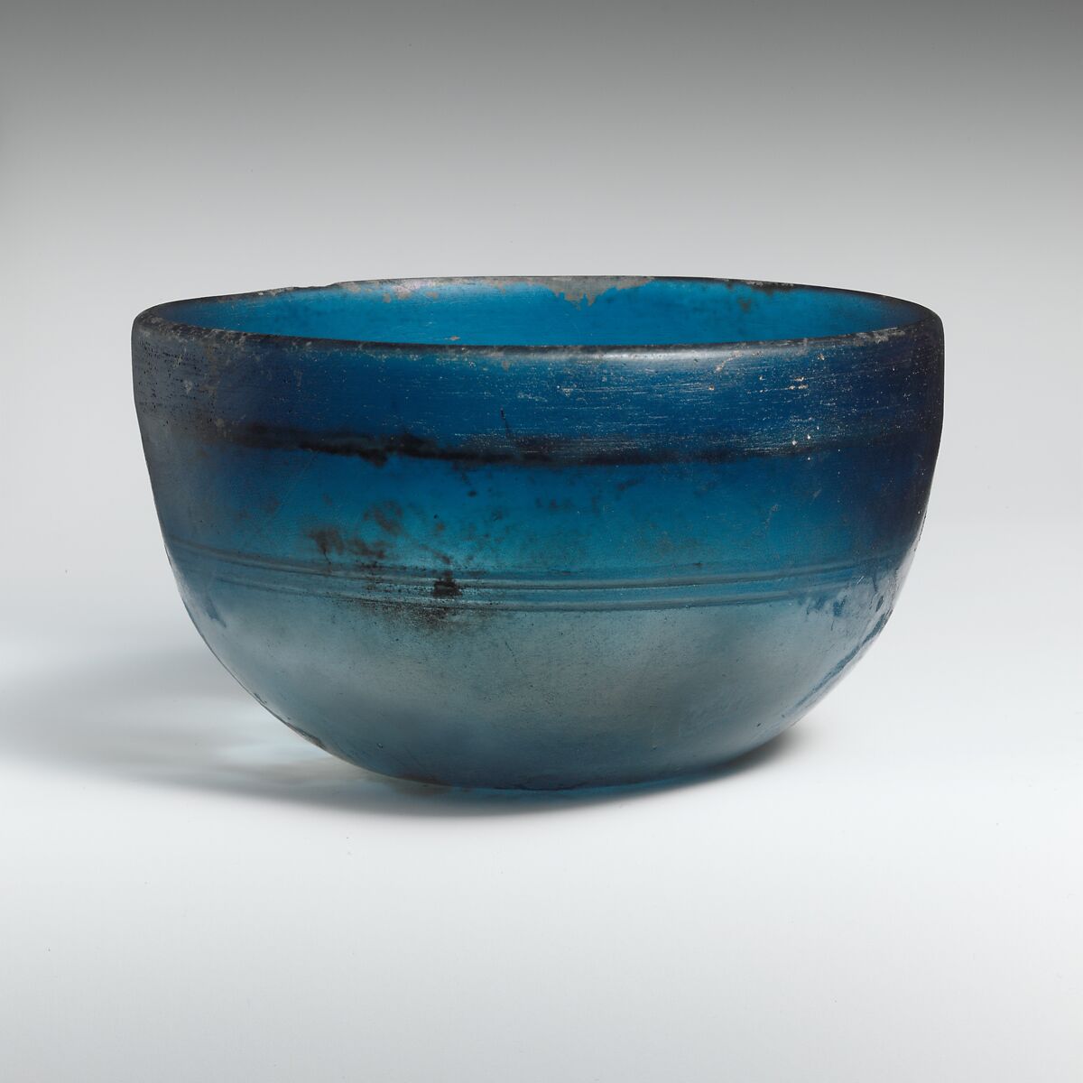 Hemispherical blue bowl with horizontal cut bands.