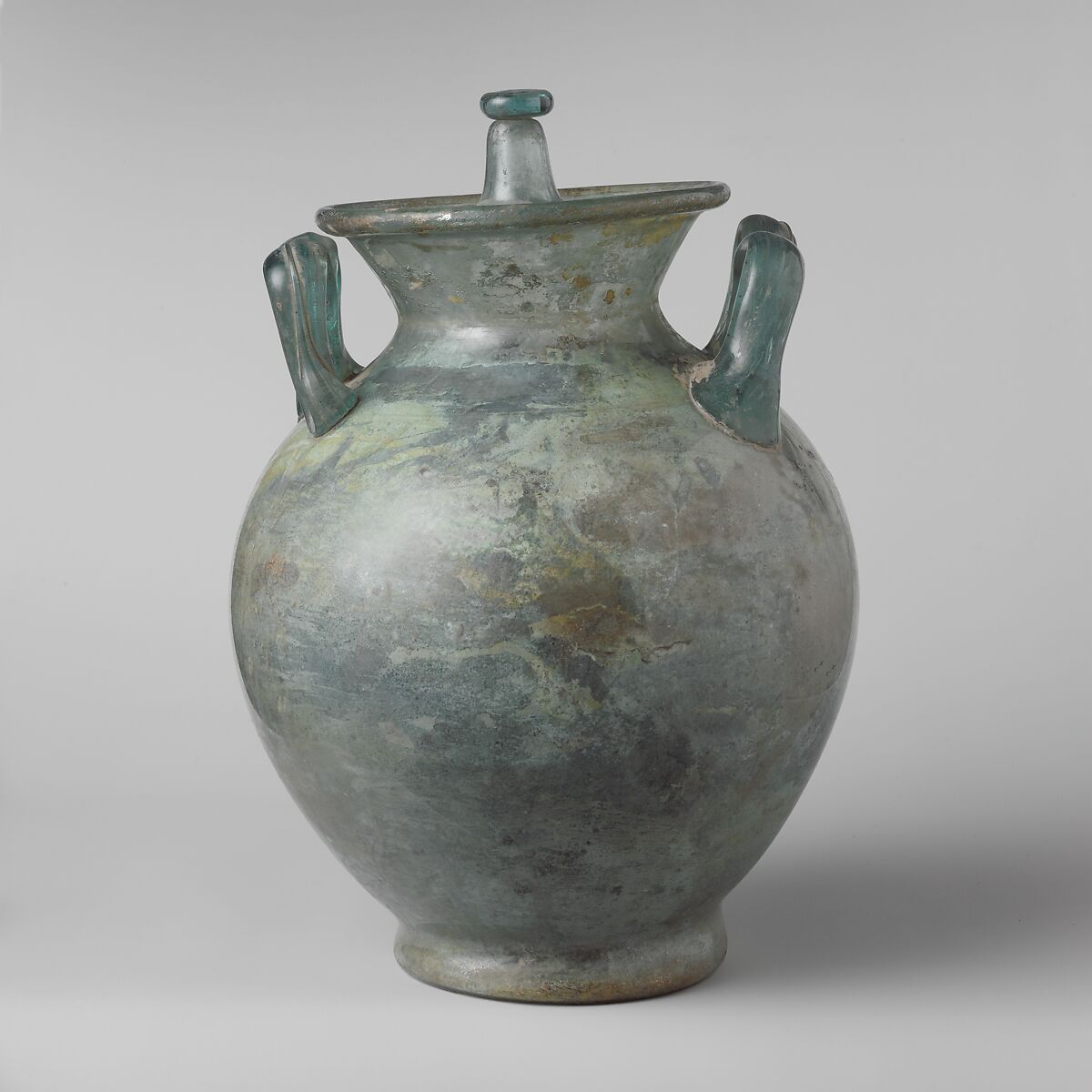 When placed in a tomb, the glass cinerary urn was often enclosed in a stone vessel or lead canister for safekeeping. Many examples have been excavated from tombs in Italy, Gaul, and Britain, although not all included (as here) a lid.