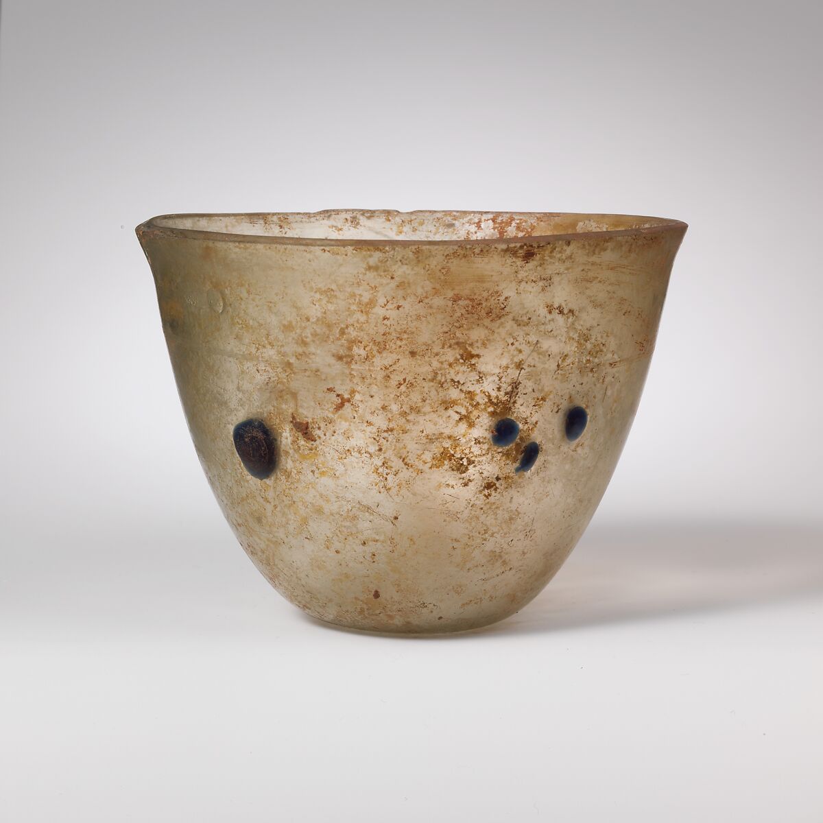 Intact, except for small chips in and below rim, and on bottom; few bubbles; dulling, iridescence, and enamel-like brown weathering.