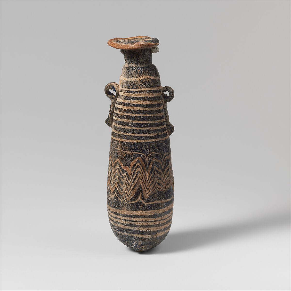 Uneven rim-disk, with tooling indents in upper surface; cylindrical neck; narrow rounded shoulder; elongated oval body with marked upward taper; convex, slightly pointed bottom; below shoulder, two vertical ring handles with knobbed tails applied over trail decoration; one with a longer tail than the other.