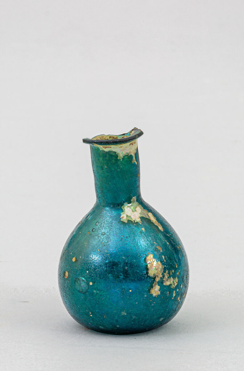 Body complete, but missing two-thirds of rim; pinprick and some large bubbles; pitting, small patches of whitish weathering, and iridescence on exterior, soil encrustation and whitish weathering on interior.