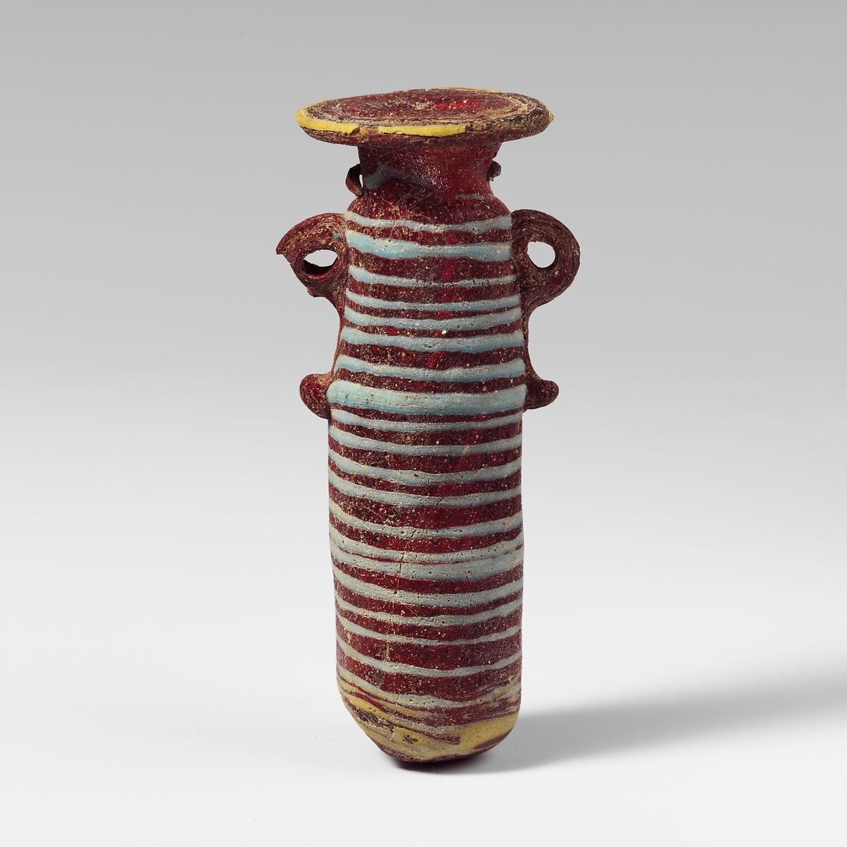A yellow trail attached at edge of rim-disk; a turquoise blue trail applied to neck, wound in a close-set spiral down body; another yellow trail applied over the turquoise blue in an uneven band around lower body and bottom.
