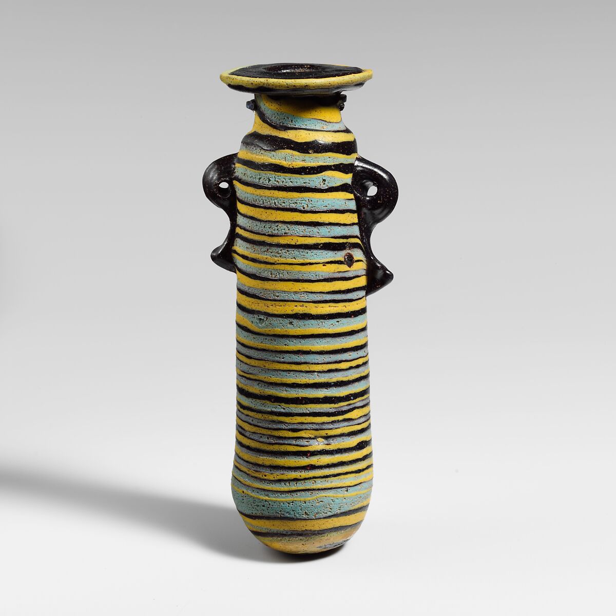 Intermingled yellow and turquoise blue trails attached at edge of rim-disk; a large yellow trail applied unevenly to neck together with a turquoise trail, overlaid on the yellow; both wound in a close-set spiral around body to bottom; yellow trail ending in a swirl on bottom; one small unmarvered blob of red brown on side near handle.