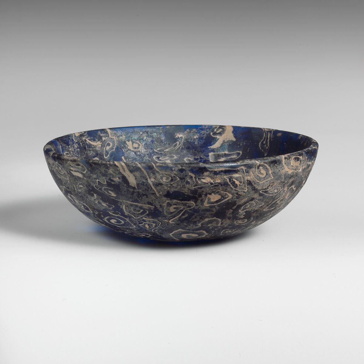 Upright rim with rounded edge; convex curving side; shallow convex bottom.
