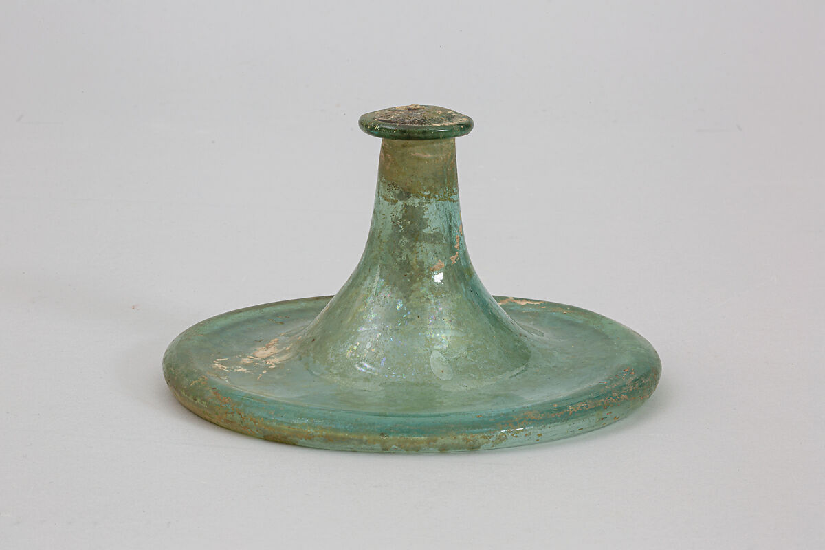 The lid must have belonged to a glass cinerary urn. Lids such as this with a perforated knob have also been described as libation funnels since examples have been found with the lid pointing down into the urn so that libations could be poured over the ashes of the deceased.