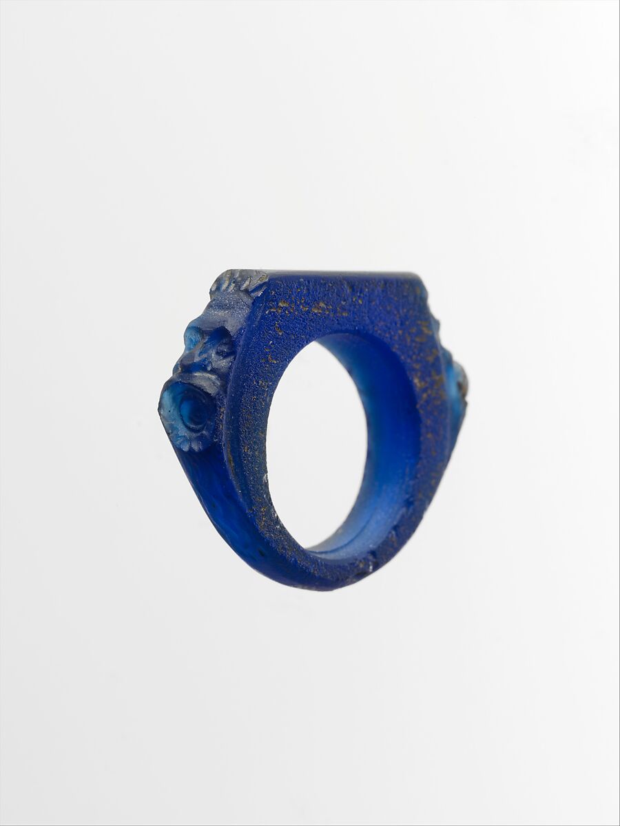 On bezel, engraved long object, perhaps a leaf, tapering to one end; on shoulders, comic masks carved in relief, with hair on edges on bezel, sunken eyes, broad nose, large round mouth and long beard extending around outside of hoop.