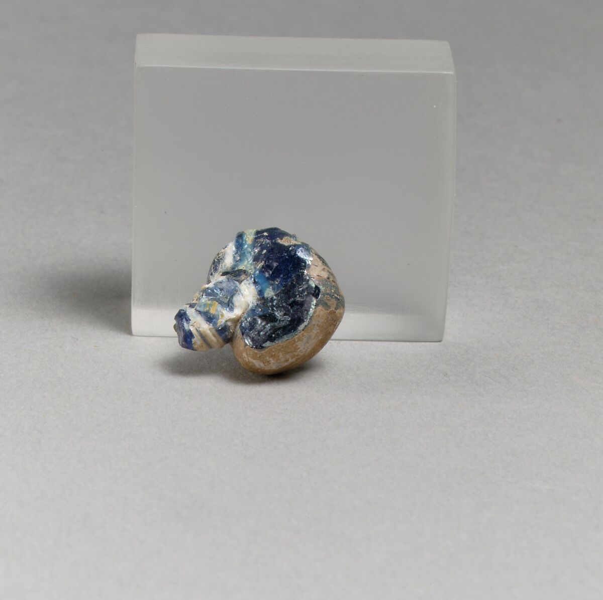 Large irregular cylindrical bead, with hole in one end of body; stem, decorated with white spiral trail in relief, applied to top of bead.
