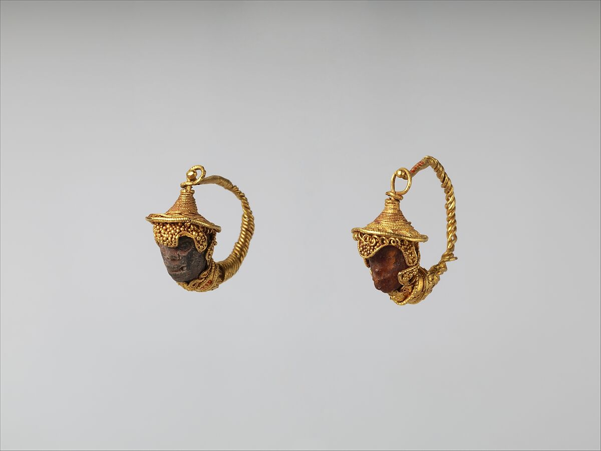 Molded amber in the form of heads of Black African youths with granulation as hair and filigreed conical hats.