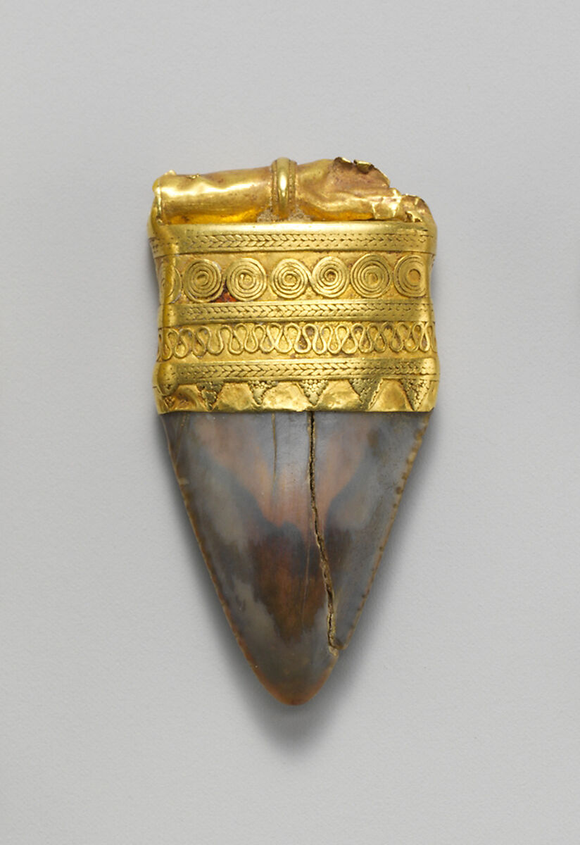 Shark's tooth mounted in gold, ornamented with filigree.