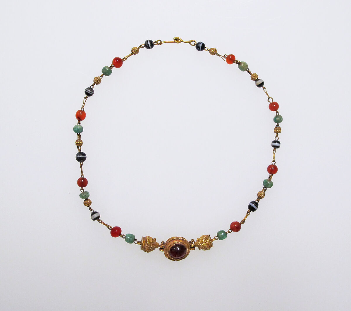 - Title: Gold, emerald, carnelian, banded onyx, and garnet necklace
