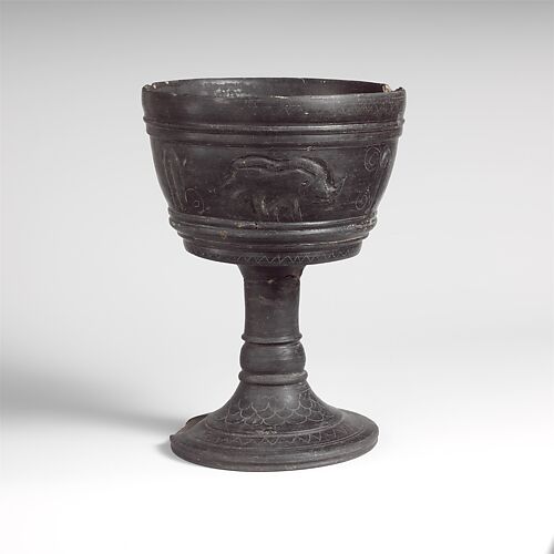 This highly ornate type of drinking vessel is common at Vulci. The identical heads on the bowl and the truncated figures on the stem may all represent the Mistress of the Animals, who is usually associated with the goddess Artemis.