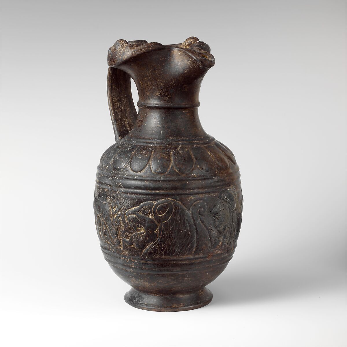 Trefoil lip, with two stags, two lion-heads, and two human heads in relief.
