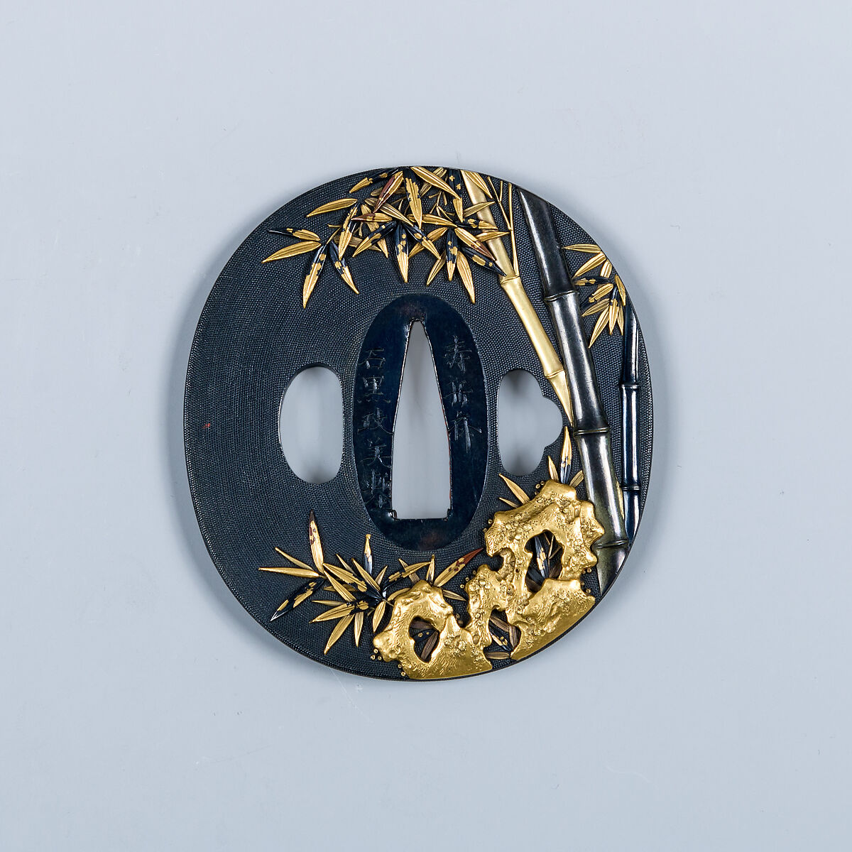 Tsuba were originally utilitarian fittings, made to protect the hand from the cuts of an opponent's sword. From the sixteenth century onward, however, more decorative tsuba became the specialty of some craftsmen. By the nineteenth century, when this tsuba was made, there were many well-defined schools and styles of tsuba making. Tsuba were interchangeable and were often made as part of sets of matching sword fittings, which could be mounted with blades of various types and dates. This tsuba features a design of bamboo amid rocks.