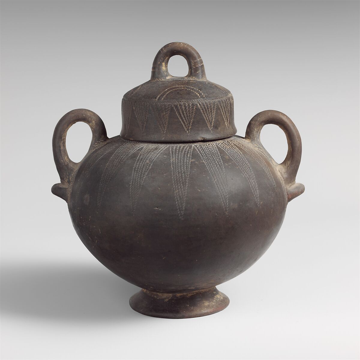 Two-handled with cover, both decorated with incised design of rays.