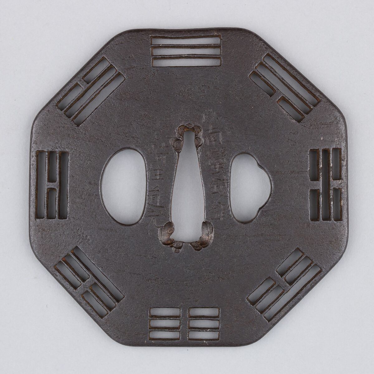This example, made of iron, is pierced along its hexagonal perimeter to produce the bold silhouettes of the eight trigrams (Chinese, pa-kua; Japanese, hakke) said to have been created by the Chinese emperor Fu Hsi, who reigned in the third millennium B.C. The trigrams provide the foundation of the I-Ching (Book of Changes), a renowned Chinese source of wisdom that combines Taoist and Confucian ideals and is used as a guide to prophecy, divination, and statecraft. The eight symbols are composed of unbroken lines, representing the yang (the male principle, or heaven), and broken lines, representing the yin (the female principle, or earth). The pattern found on this tsuba is an arrangement of the trigrams attributed to Fu Hsi himself, known as the precelestial ordering. Each trigram is subject to various levels of interpretation and can signify an essential element of nature, such as thunder, water, or wind; physical and emotional traits, including power, satisfaction, and flexibility; talismanic animals; seasons of the year, and points of the compass. In addition, when displayed on an object such as this tsuba, the trigrams serve as potent auspicious symbols and convey respect for ancient wisdom.