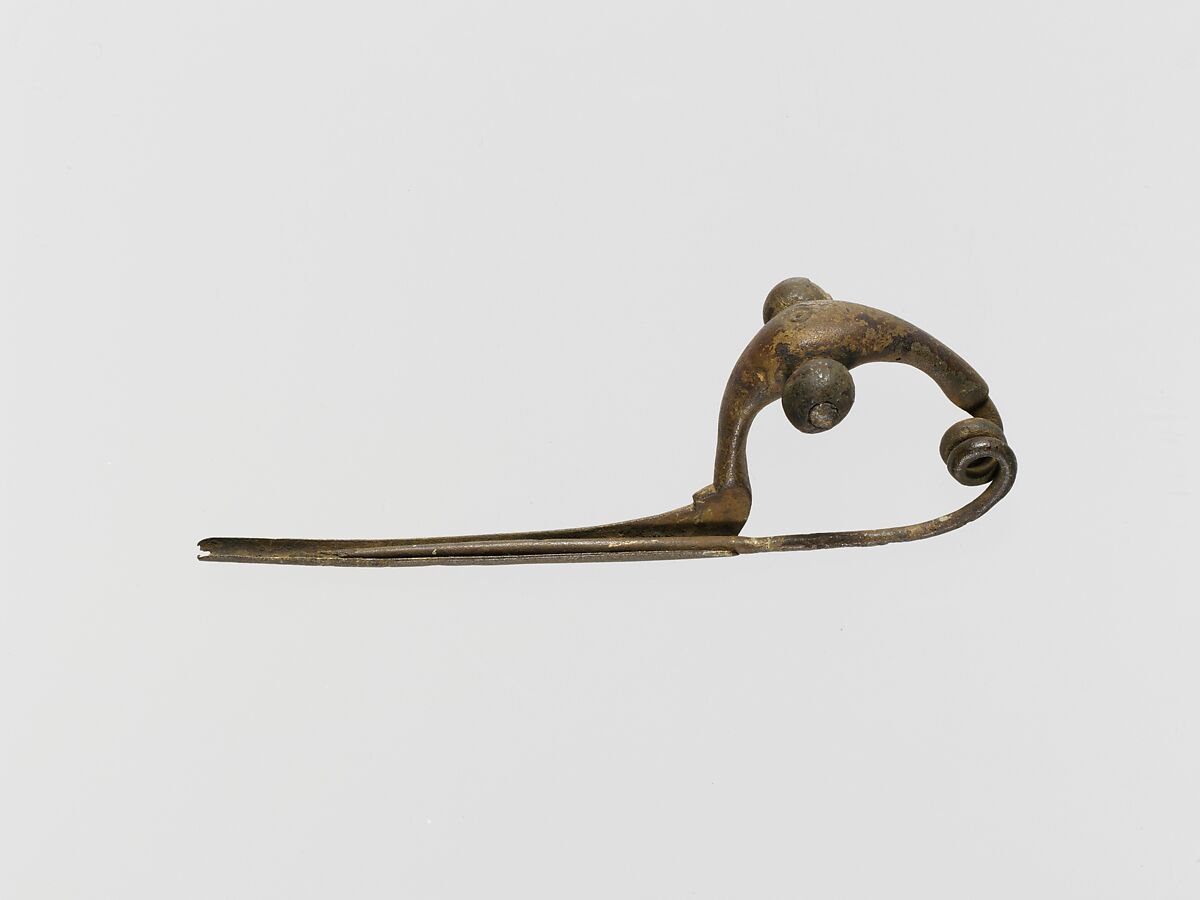 The bow is hollow. On its upper surface is a punched circle. The head is formed by a spiral of two turns.