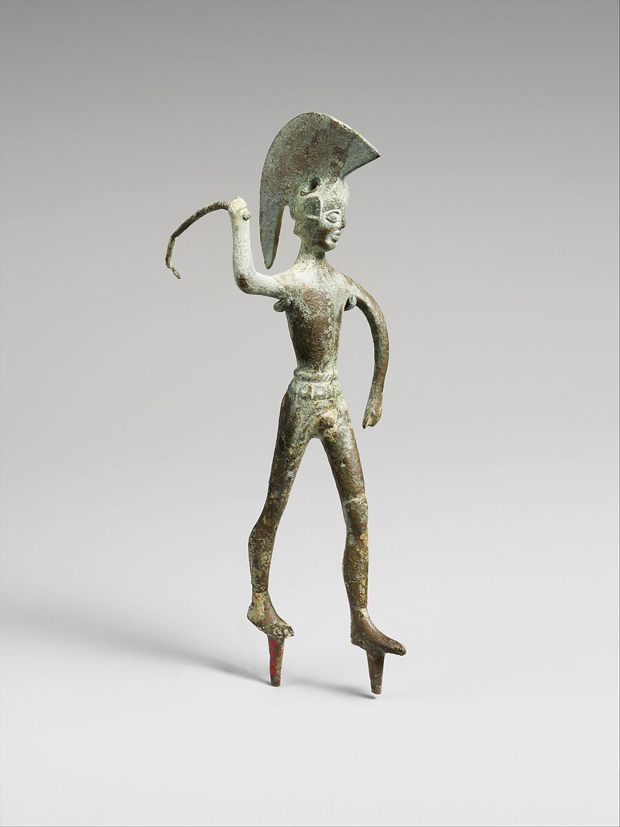 The small warrior strides forward, brandishing a bent spear held in his right hand. His left arm is lowered and held beside his thigh; perhaps originally, he held a shield in his left hand. He wears an incised crested helmet with raised cheek- pieces, a breastplate, and greaves decorated with spiral patterns. A tang extends from the bottom of each foot, indicating that the statuette was originally mounted on a wooden or clay base.