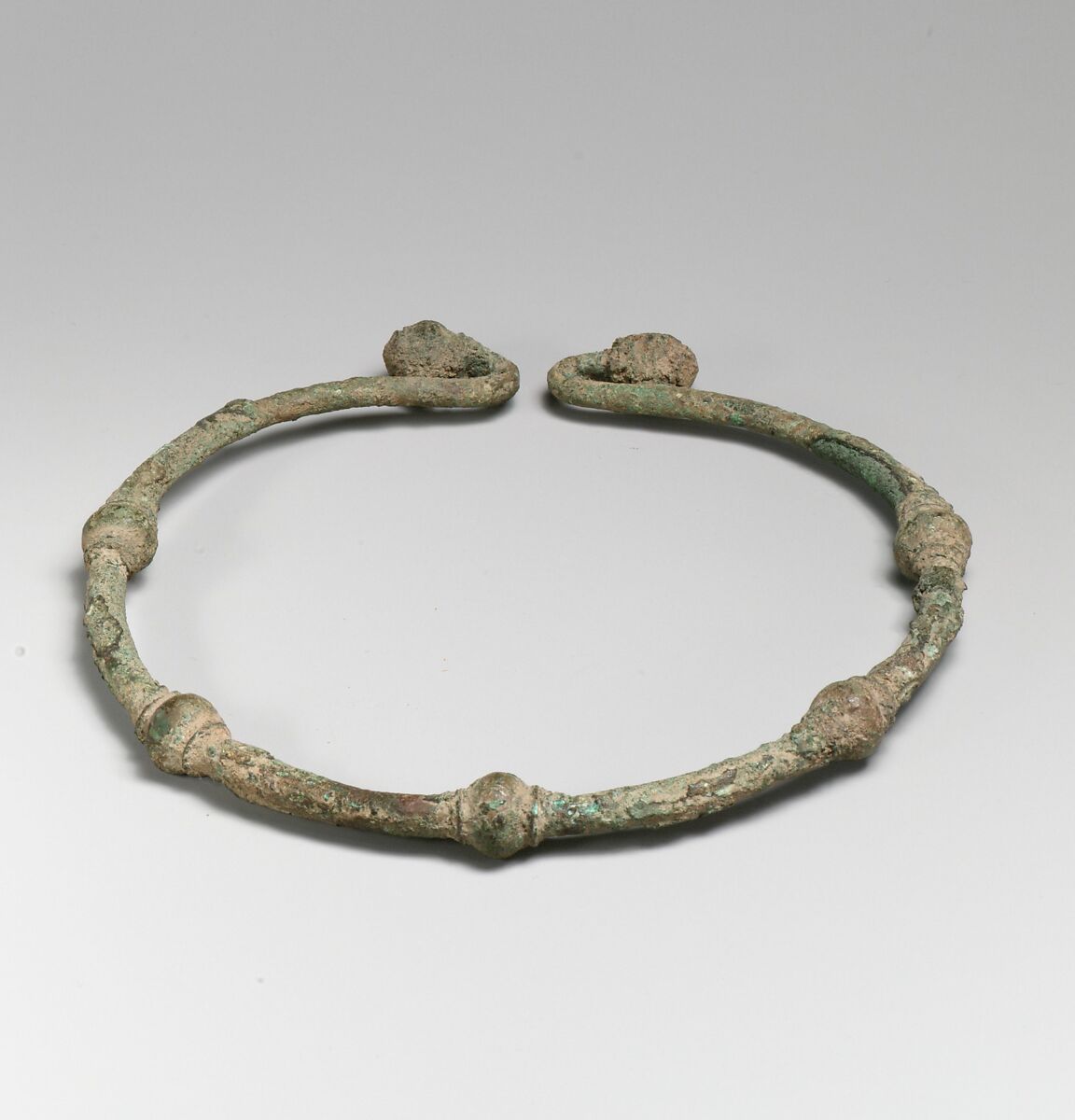 Open ring with five ornamental collars and open, out-curving ends, terminating in knobs.