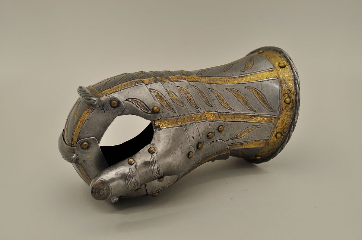 The close-gauntlet (or locking gauntlet) is a special form of mitten gauntlet for the right hand which can be locked in a closed position so the sword cannot be dislodged from the grip. The close-gauntlet appeared at the turn of the sixteenth century, when new and more specialized forms of armor were being developed for the joust and tournament. It was designed exclusively for use with a sword in foot combat, in a closed arena or over a barrier, or in a mock battle with a group of knights on horseback. Though numerous tournament regulations prohibited its use ("He that shall have a close gauntlett, or any thinge to fasten his sword to his hand, shall have no prize"), a sufficient number of examples survive to prove that it enjoyed considerable popularity. A very early example of the close-gauntlet is associated with the foot-combat armor of Claude de Vaudrey, made in Milan about 1495 (Vienna Waffensammlung, inv. no. B. 33), which suggests that it may have been an Italian invention. Another early example is the close-gauntlet belonging to the foot-combat armor of Henry VIII of England, about 1520 (Tower of London, inv. no. II 6), which predates the long series of close-gauntlets that accompany the garnitures of armors made at the Royal Workshops at Greenwich, beginning with the so-called Genouilhac armor of 1527 (Metropolitan Museum, acc. no. 19.131.1).