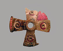 Bronze disk with ivory cross inlaid with amber circles and amber between arms of cross.