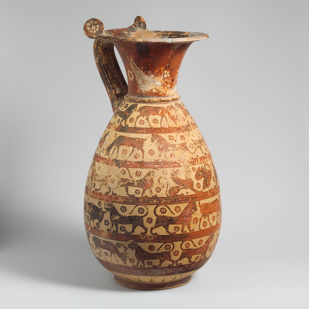 The Sphinx Painter was a competent artist who is closely associated with the Polyteleia Painter, to whom the very fine dinos (deep bowl; 1997.36) exhibited in the Belfer Court is attributed.