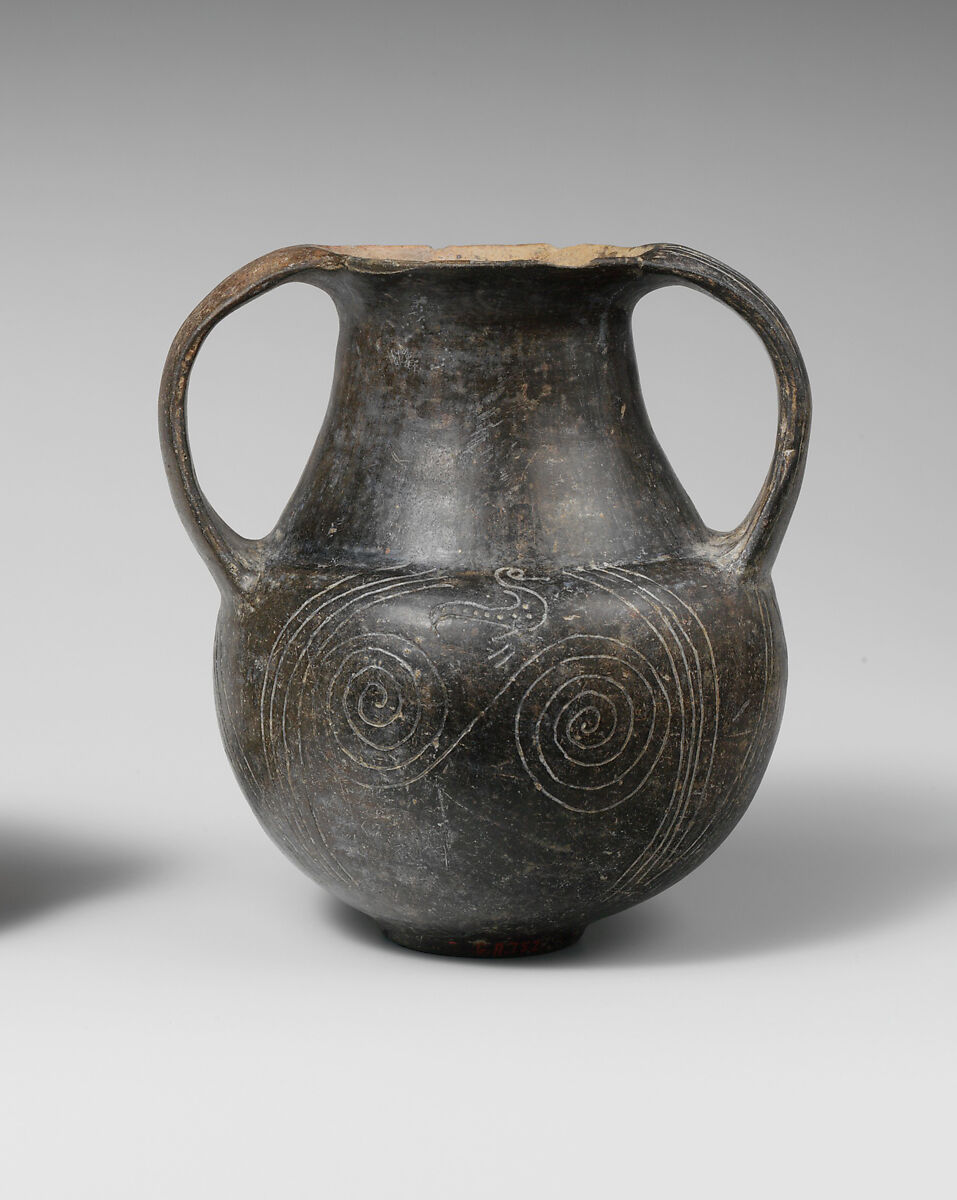 This distinctive shape, frequently incised with double spirals, is indigenous to Italy. The thin, flat handles and sharp curves imply that the shape derives from metallic prototypes, and indeed a silver example with gold handles was found in the Regolini-Galassi Tomb in Caere (modern Cerveteri).