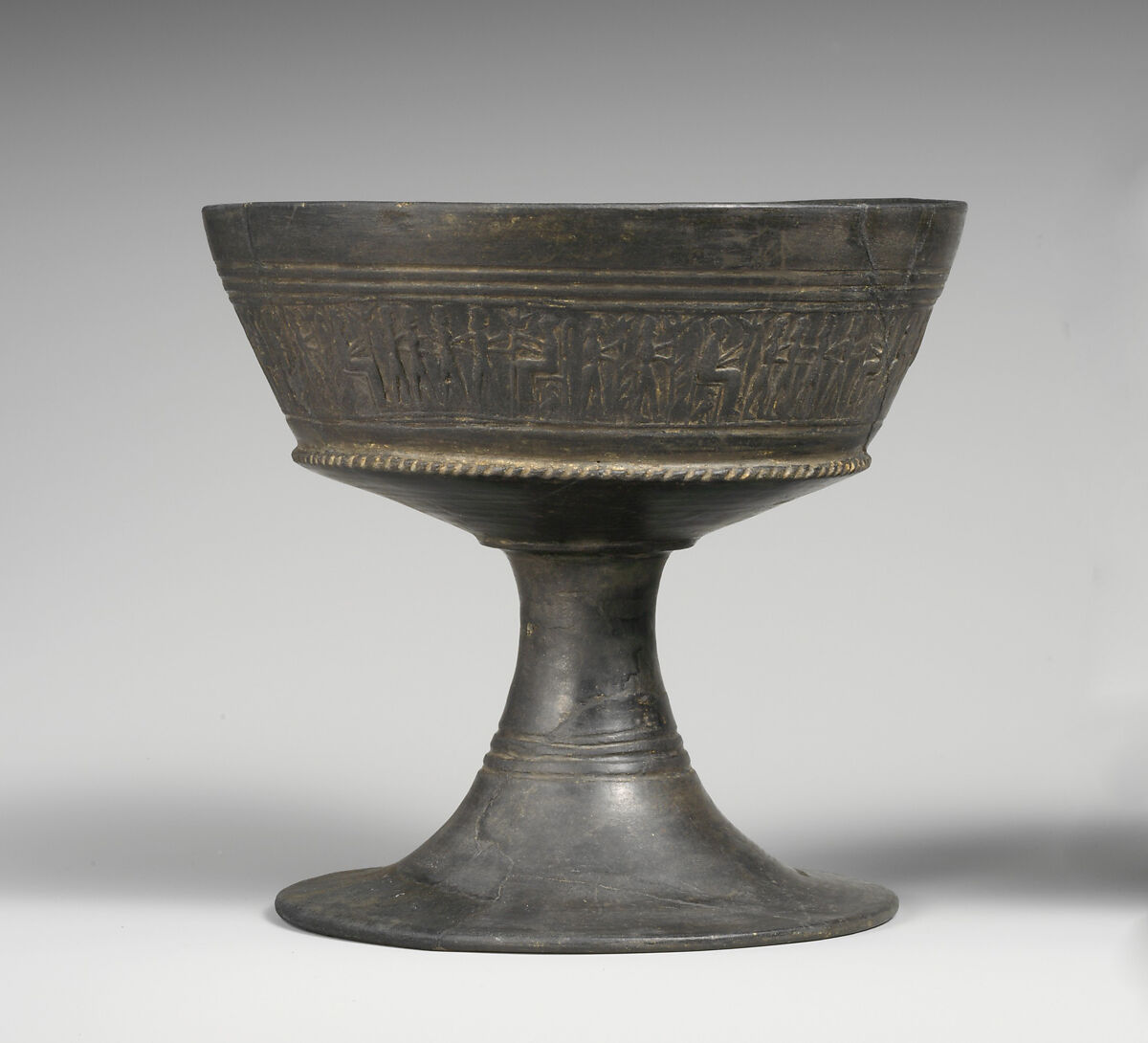 The simple elegance of this shape ensured its popularity throughout much of Etruria from about 625 to 500 B.C. The figural friezes were made by pressing a carved cylinder seal into the leather-hard clay before firing. In this case, both are identical and depict seated figures, perhaps members of the nobility, in the company of standing attendants. The subject, its specific meaning unknown, is associated with chalices made at Chiusi.