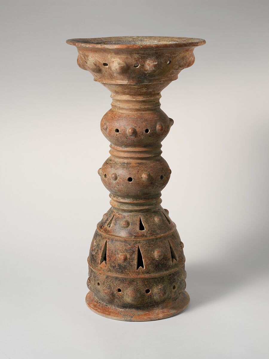With a large conical base decorated with rows of bosses and triangular perforations, two smaller elements with similar decoration, and a wide flaring top with large bosses to hold a dinos, a large cauldron-like vessel.