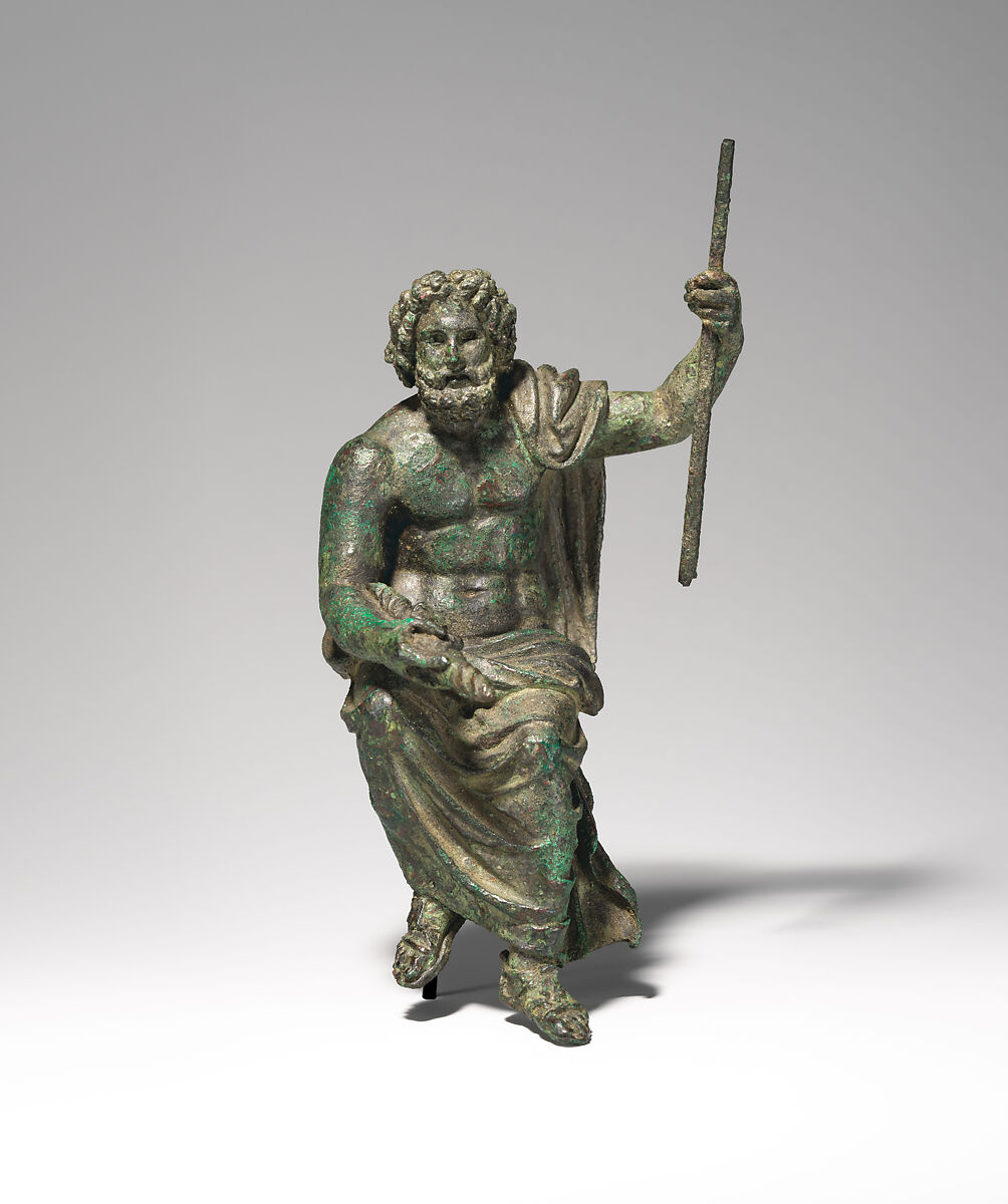 Jupiter sits enthroned in all his majesty, holding a thunderbolt in his right hand and a long scepter in his left.