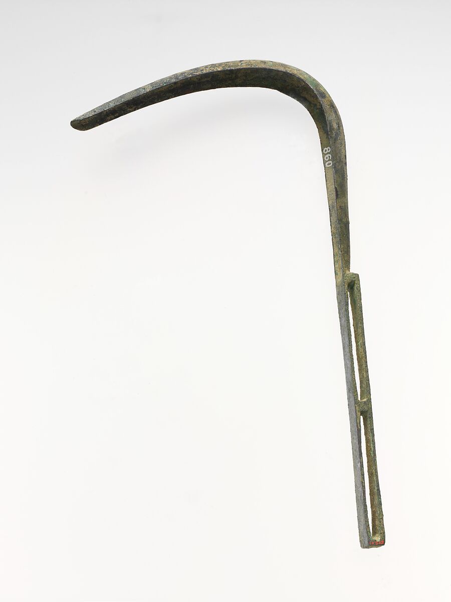 The blade is bent to an acute angle. The handle, which is in one piece with the blade, is in the form of a rectangular loop with a cross-piece in the middle. On the back of the handle are incised lines.