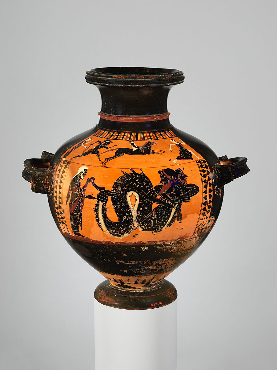 Herakles wrestling Triton is a recurrent subject, especially on hydriai and neck-amphorae of the second half of the sixth century B.C. No surviving ancient source spells out the story. Its popularity on hydriai is due partly to Triton's being a marine creature and partly to interest in the exploits of Herakles. The pursuit of Troilos is pertinent because, as he fled, his sister Polyxena dropped the hydria in which she was carrying water from the fountain house.
